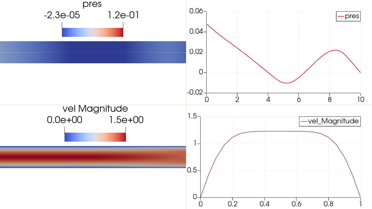 The solver behaves as expected for the velocity field, the soltuion converges quickly to the parabolic profile expected for Poiseuille flow in a 2D channel. However, the pressure field exhibits stong oscillations, especially near the beginning of the simulation (see images below). The solution eventually converges toward the physically correct steady-state, but this is not suitable for unsteady problems where the outlet pressure is prescribed as a transient boundary condition (e.g., modeling physiological outflow or time-dependent traction).